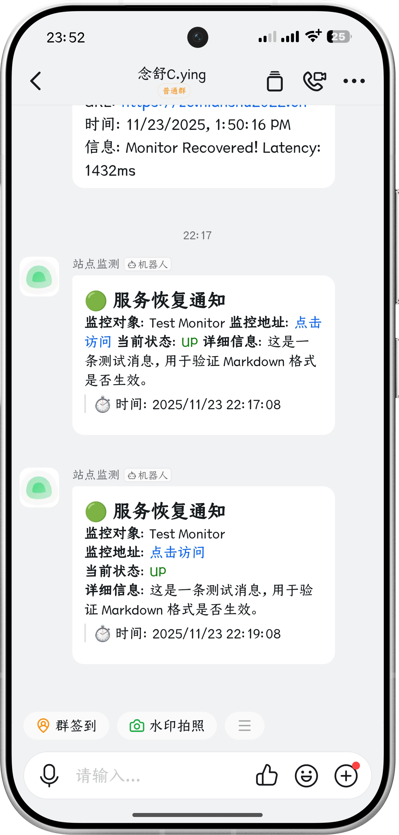 - 🤖 灵活告警:目前接入了 钉钉群机器人,支持 Markdown 格式,不仅告诉你挂了,还告诉你为什么挂了(超时/500/证书过期)。